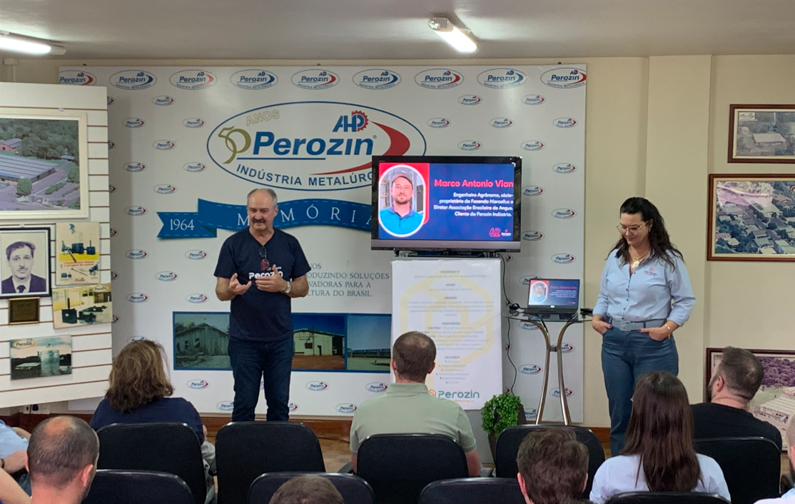 O evento também contou com a participação do Sr. Marco Antonio Vian, Engenheiro Agrônomo, Sócio Proprietário da Fazenda Marcellus e Diretor da Associação Brasileira de Angus, representando todos os clientes da Perozin destes 62 anos de mercado. Cliente da Perozin há mais de uma década, Sr. Marco trouxe ao público um relato próximo e inspirador sobre sua trajetória com a empresa, além de compartilhar aprendizados adquiridos à frente de sua propriedade. Sua fala reforçou em como se sente satisfeito com a parceria Perozin: “São flexíveis e olham para o cliente de forma individual. Não chegam com um projeto pronto na sua propriedade e dizem é isso e acabou… E é um grande diferencial que eu vivenciei e também ouvi isso de outros clientes. Eles olharam para o que eu já tinha e fizeram um projeto personalizado para o que eu precisava.”